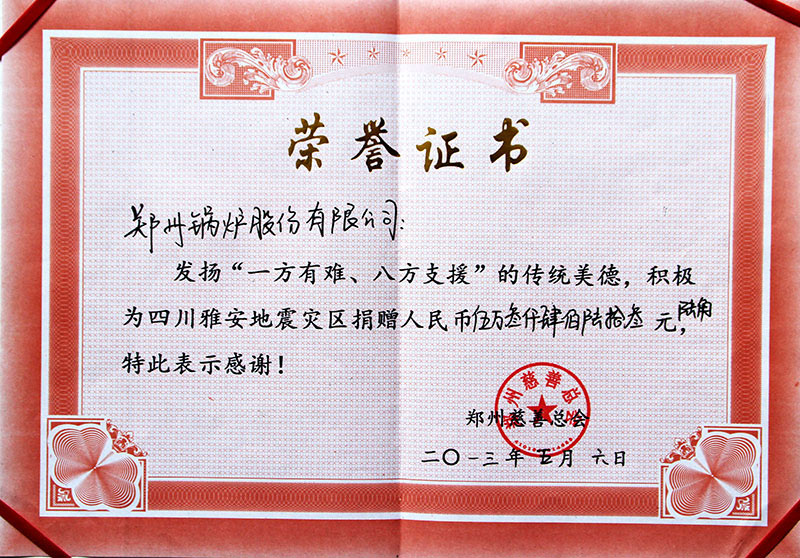 近年來(lái),鄭鍋憑借一流的技術(shù)、過(guò)硬的產(chǎn)品、周到的服務(wù),先后榮獲河南省高新技術(shù)企業(yè)、管理先進(jìn)單位、鄭州市高成長(zhǎng)性民營(yíng)企業(yè)、鄭州市百?gòu)?qiáng)企業(yè)、五一勞動(dòng)獎(jiǎng)等多項(xiàng)榮譽(yù)。