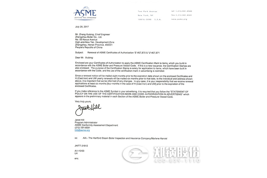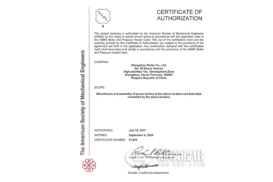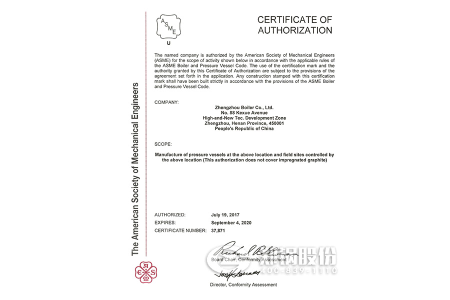 2017年7月,鄭鍋股份順利通過(guò)了ASME換證聯(lián)檢評(píng)審。聯(lián)檢組專家對(duì)鄭鍋股份進(jìn)行了深入細(xì)致的評(píng)審后認(rèn)為公司執(zhí)行標(biāo)準(zhǔn)情況符合ASME要求,準(zhǔn)許換證。日前,美國(guó)機(jī)械工程師協(xié)會(huì)已向鄭鍋頒發(fā)新的ASME鋼印和授權(quán)證書(shū),有效期自2017年7月19日至2020年9月4日。